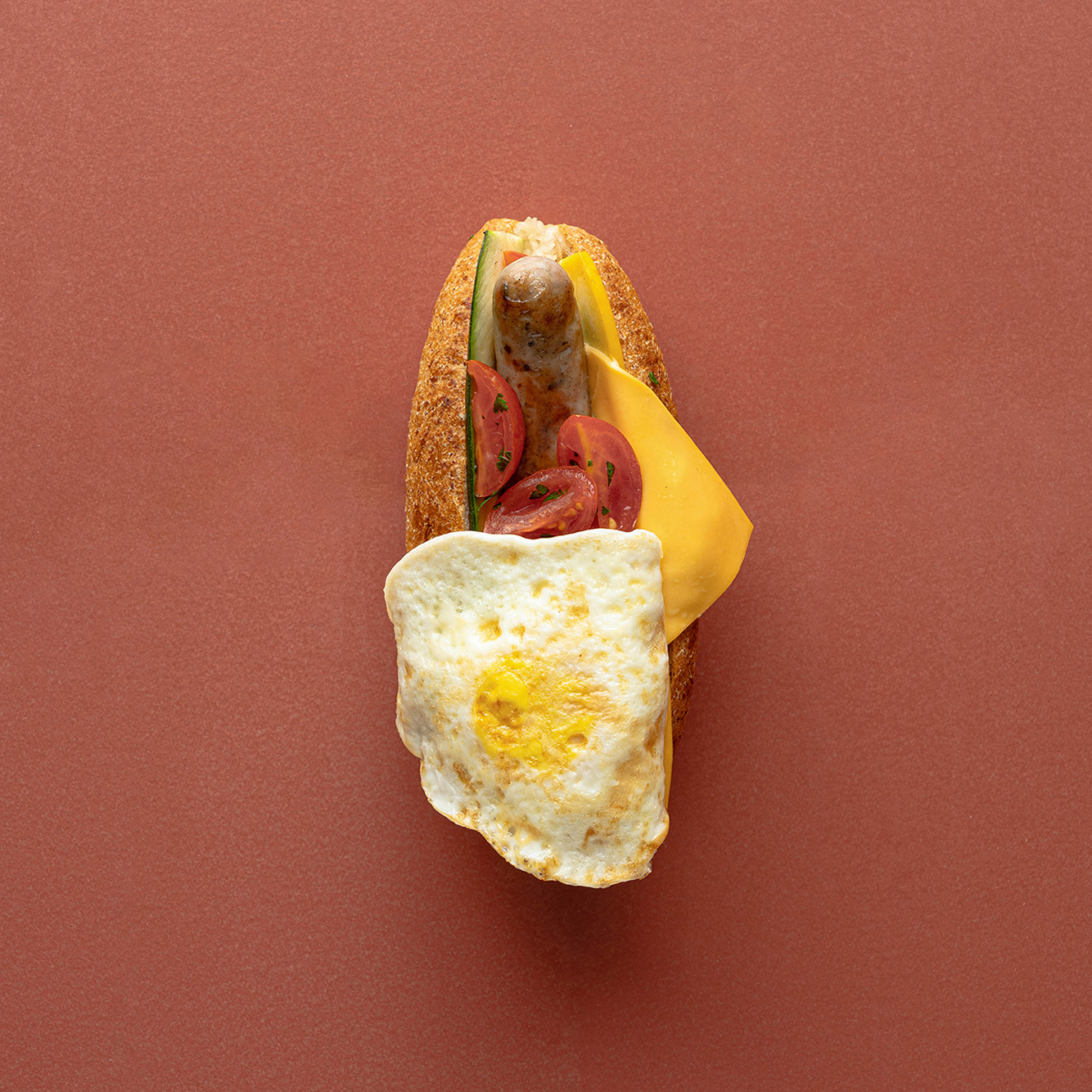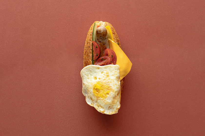 紐澤西經典早餐的重現。鼠尾草香腸、半熟蛋與濃郁起司交融,搭配醃漬番茄與櫛瓜,是一份豐盛又清爽的美式經典。