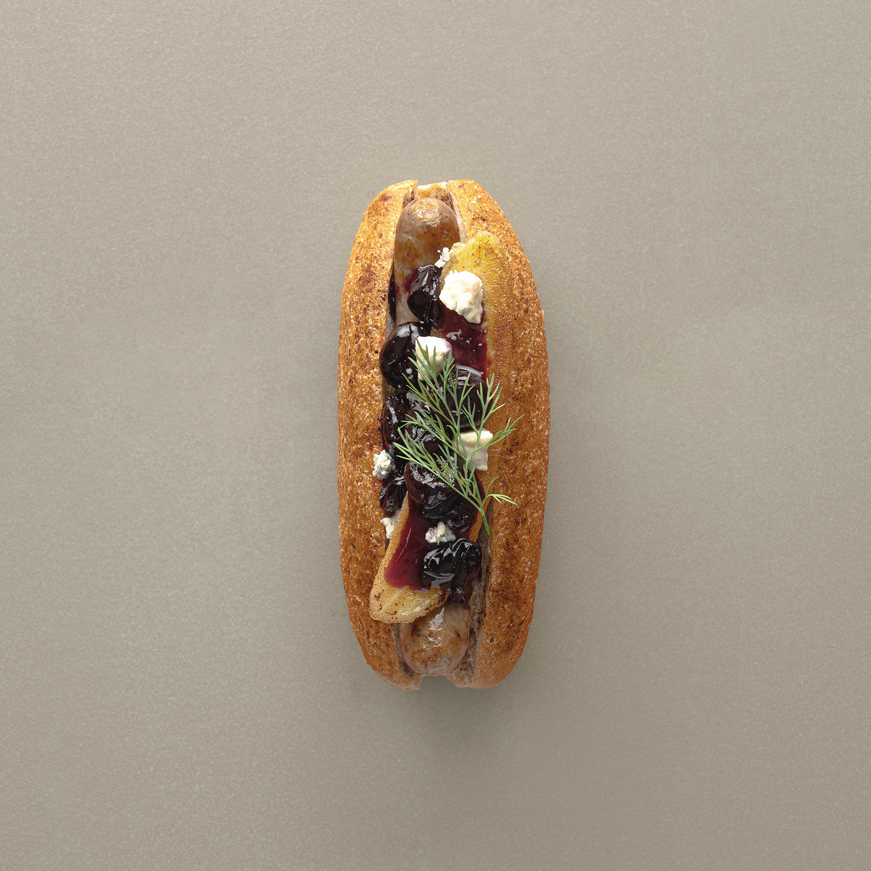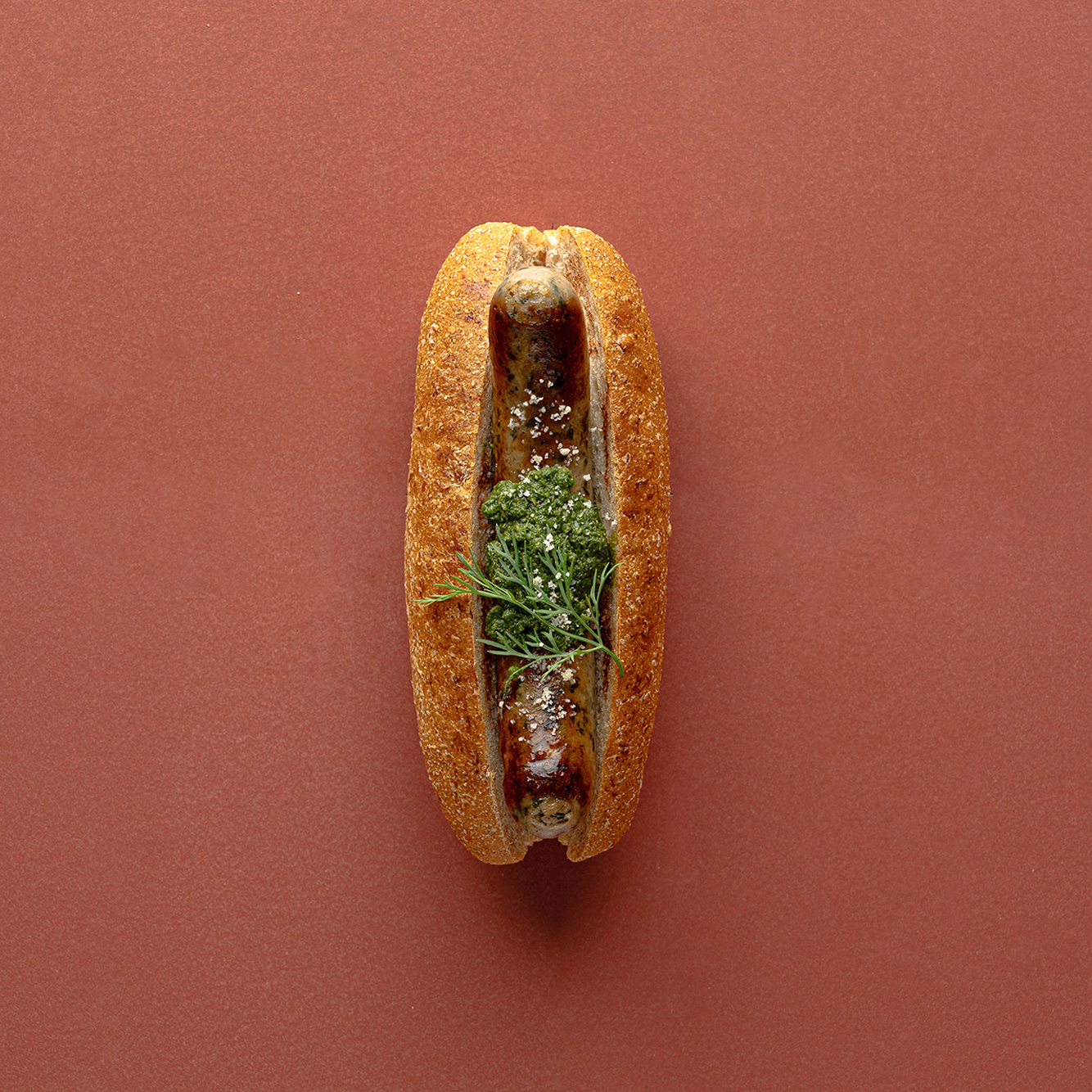 來自義大利的熱內亞青醬,散發羅勒與杏仁芬芳。搭配多汁的手工羅勒香腸,風味與麵包完美融入。