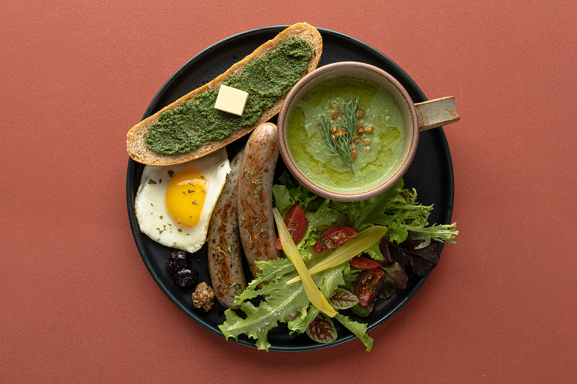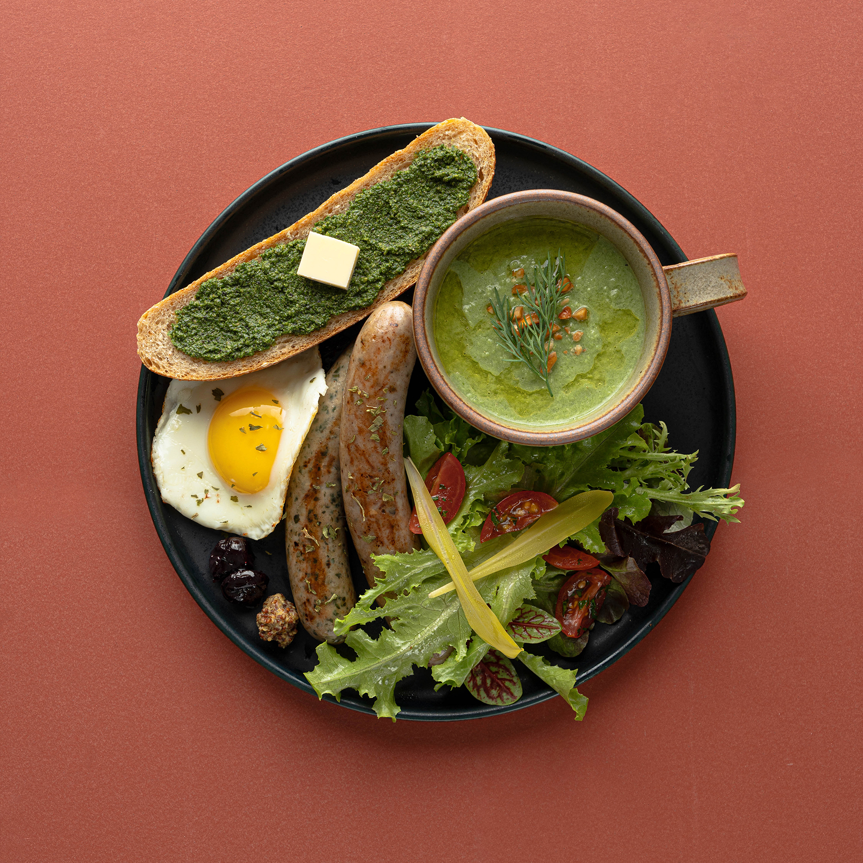 一份隨時享用的豐盛早餐。羅勒與鼠尾草香腸的鹹香,搭配自製羅勒醬的艾瑪麵包,誰說 MORNING 只能在早上?