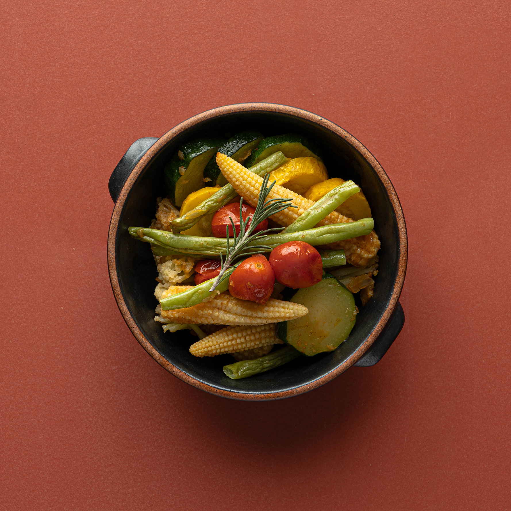 嚴選多種時令蔬菜,以高溫烘烤鎖住食材的純粹甜味。僅以簡單調味,呈現大地的自然風味。清爽健康。