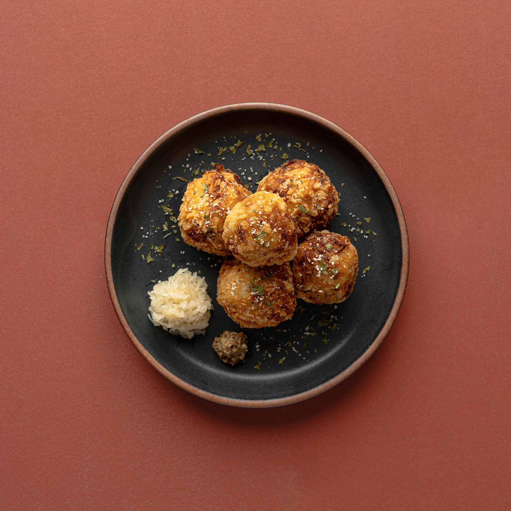源自歐陸的經典小食。將德式酸菜的爽脆酸香,炸至金黃酥脆。外酥內軟,是搭配餐酒的完美開胃小點。