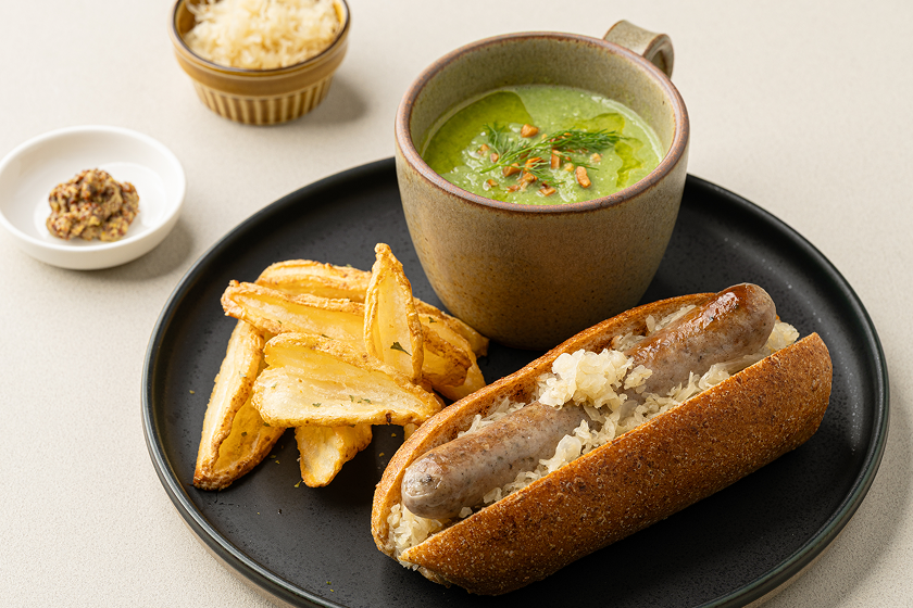 溫暖的燉菜料理,呈上自家製手工香腸與滿滿酸菜。以「清爽的日式洋蔥醬汁」重新詮釋,風味溫和、輕盈不膩。